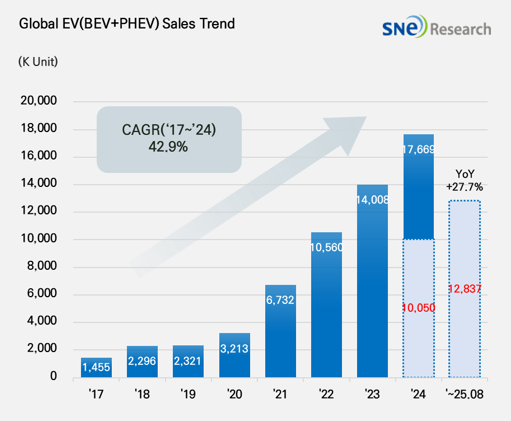2025년 1~8월 글로벌 전기차 인도량 약 1,283.7만 대, 전년 대비 27.7% 성장 NEW