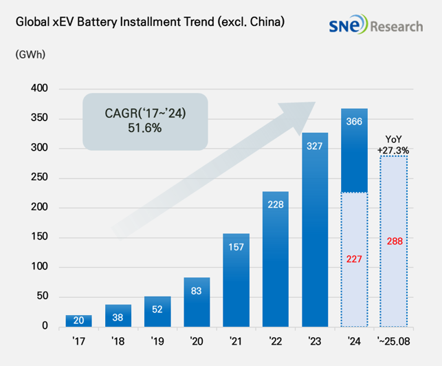 2025년 1~8월 非중국 글로벌 전기차용 배터리 사용량 288.3GWh, 전년 동기 대비 27.3% 성장 NEW
