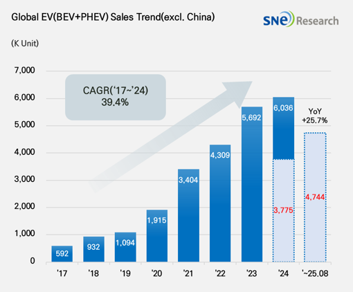 2025년 1~8월 非중국 글로벌 전기차 인도량 약 474.4만대, 전년 대비 25.7% 성장 NEW