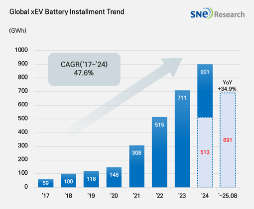 2025년 1~8월 글로벌 전기차용 배터리 사용량 691.3GWh, 전년 동기 대비 34.9% 성장 NEW
