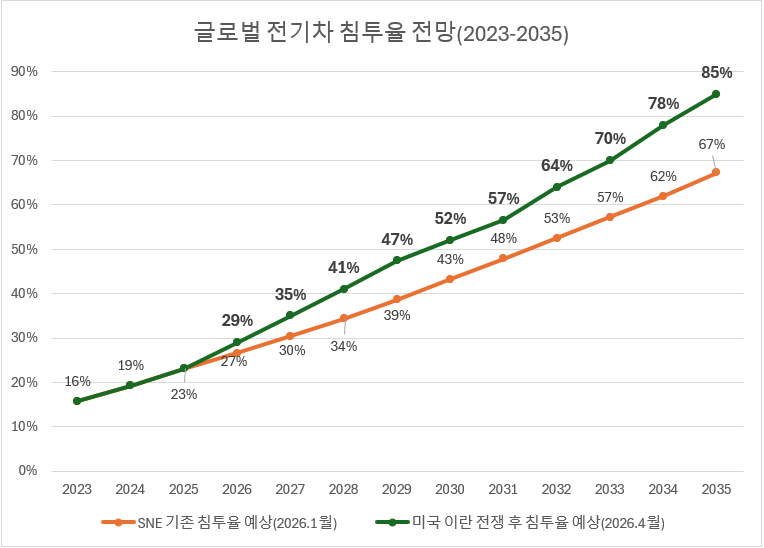 전쟁으로, 극적인 회복기 맞는다. SNE리서치는 최근의 미국-이란전쟁으로 인한 유가상승의 영향으로 과거3년간 침체되었던 전세계 전기자동차시장의 수요가 올해는 이전 수요예측대비 0.5년
