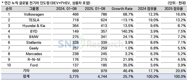그룹별로 살펴보면, 중국을 제외한 글로벌 전기차 인도량에서 폭스바겐
