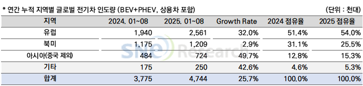 제목 : 2025년 1~8월 非중국 글로벌[1] 전기차 인도량[2] 약 474.4만대, 전년 대비 25.7% 성장