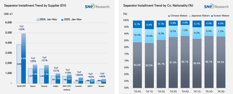 2025년 1~11월 글로벌 분리막 시장에서는 주요 공급업체들의 성장이 두드러졌다. 특히 SEMCORP가 전년 동기 대비 29% 증가한 4,956Mil ㎡를 기록하며 시장 내 우위를 이어갔으며, Senior(+28%),